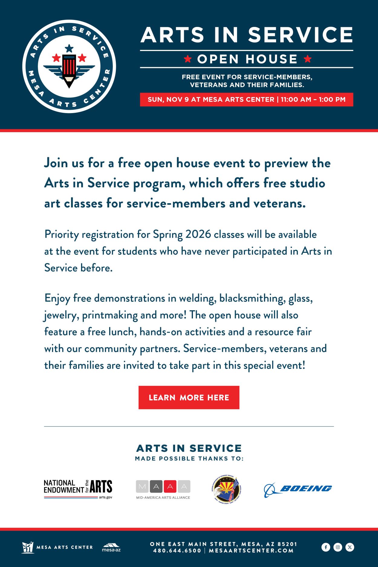 Join us for a free open house event to preview the Arts in Service program, which offers free studio art classes for service-members and veterans. Priority registration for Spring 2026 classes will be available at the event for students who have never participated in Arts in Service before. Current students will be able to register on Weds, 11/12 at 12:00 PM. Enjoy free demonstrations in welding, blacksmithing, glass, jewelry, printmaking and more! The open house will also feature a free lunch, hands-on activities and a resource fair with our community partners, in addition to a We Serve Too Stamping Activity featuring flora and fauna (no registration necessary for this event). Service-members, veterans and their families are invited to take part in this special event!