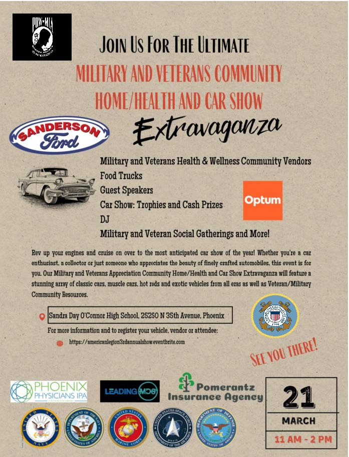 Military Branch and Veteran Organizations , Car Show, Veteran Owned Resources/Shopping Businesses, Food Trucks, more This event is a FREE Event for all Veterans, families and supporters! We have 4 Food Trucks, over 20 cars in our car show, DJ, Veteran Owned or Veteran Supported Vendors, and the TOP Veteran Speakers in Arizona! The proceeds will support local Arizona Nonprofits that support everything from Suicide Awareness, Homelessness, among others. We look forward to seeing you there and joining the camaraderie! |