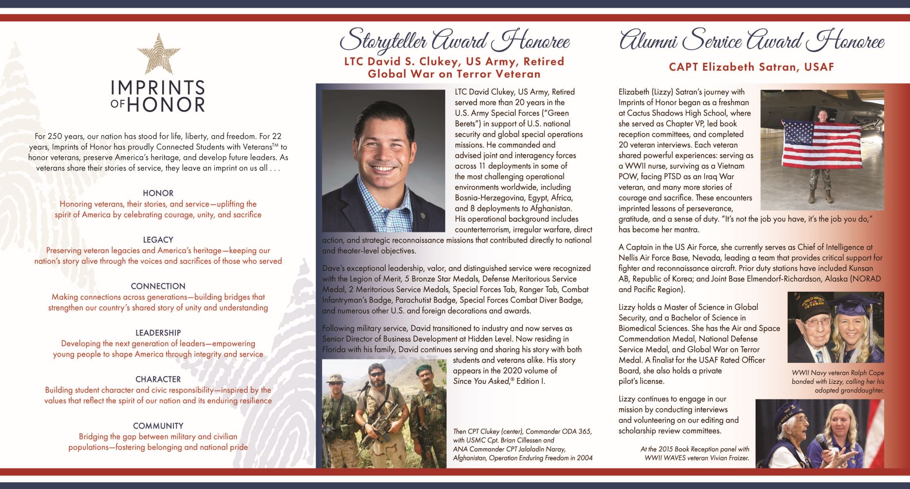 | For 250 years, our nation has stood for life, liberty, and freedom. For 22 years, Imprints of Honor has proudly Connected Students with VeteransTM to honor veterans, preserve America’s heritage, and develop future leaders. Join us as we honor service and the American spirit. |