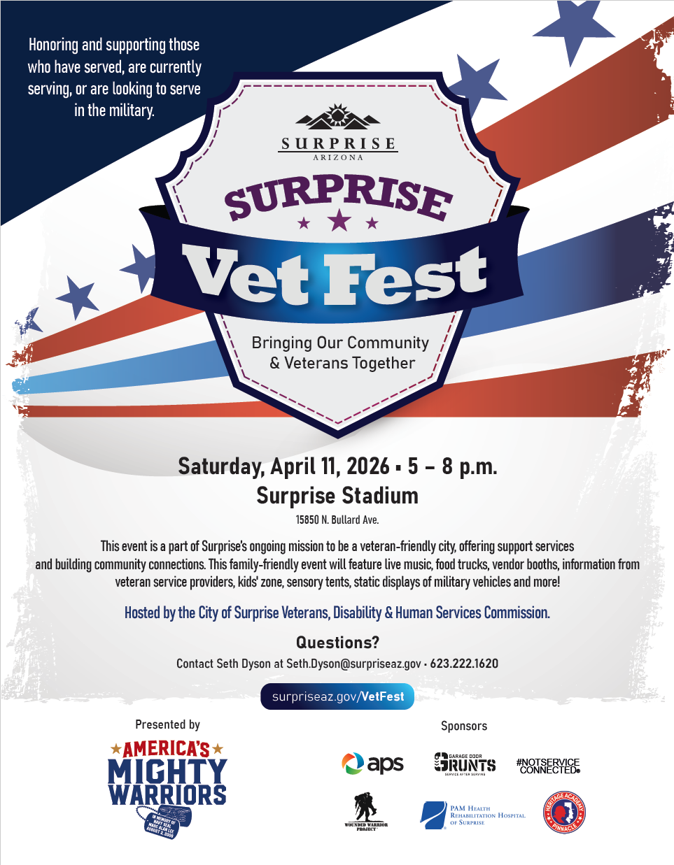 Surprise’s Vet Fest is a fun-filled evening offering those who have served, are currently serving, or are looking to serve in the military a chance to connect and learn about the support and resources available to veterans. Military families, supporters and the entire community are encouraged to take part and show their support for our veterans!