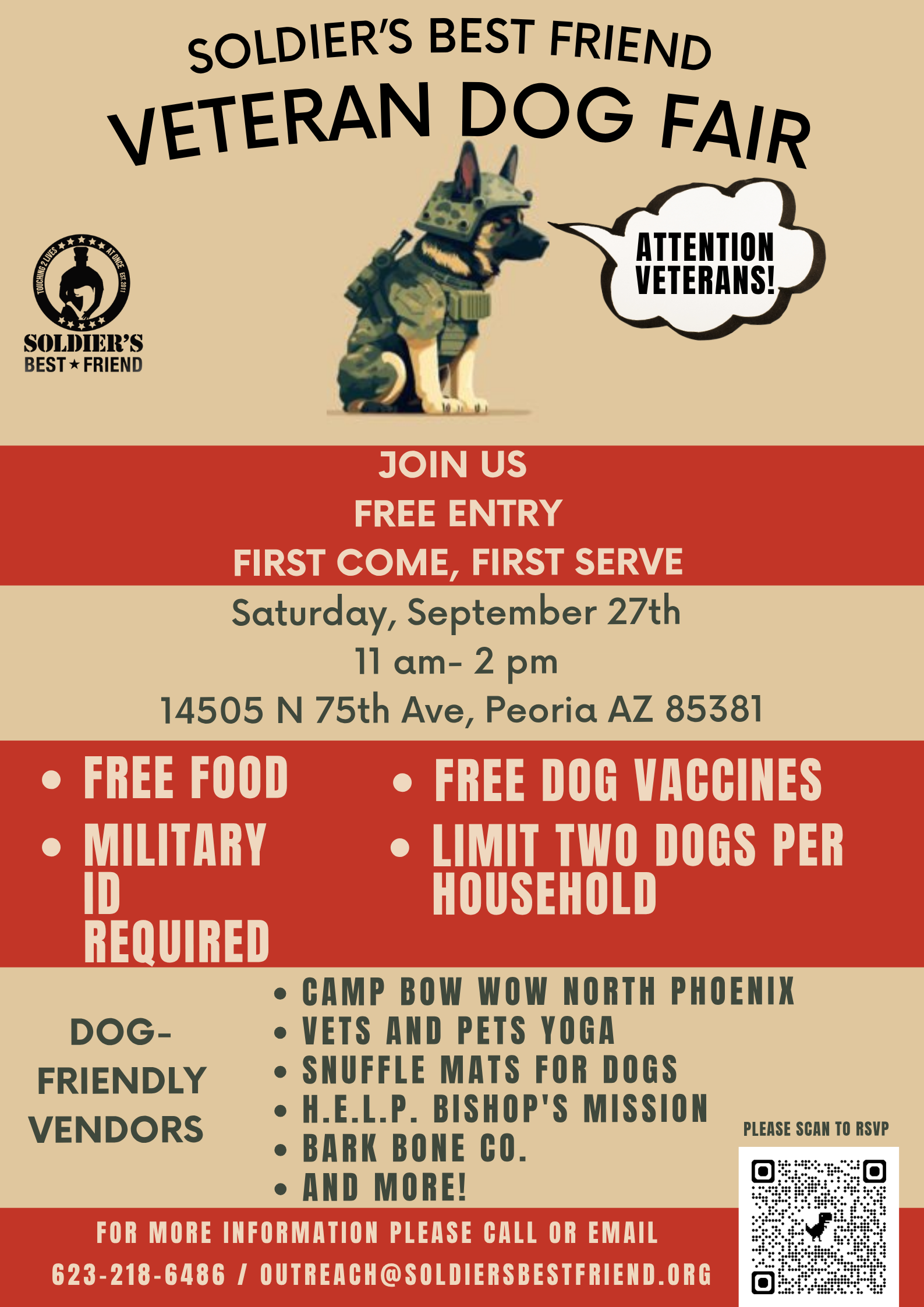 Sodlier’s Best Friend will be hosting our 2nd Annual Veteran Dog Fair, providing much needed vaccines to our beloved four legged friends. This is a FREE event for veterans, thier family members, and friends (just bring your veteran and four legged friend with you). Limit of 2 dogs per houshold, please bring your military or veteran ID. There will be pet friendly vendors, free food, and more. Come out and bring the family for a fun filled event!