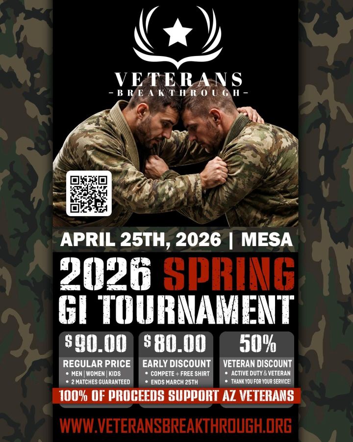 | Arizona Jiu-Jitsu – it’s time to COMPETE FOR A CAUSE! MARK YOUR CALENDARS! We have officially unlocked the early bird registration for our Spring tournament! This time around, get ready to put on your fanciest Gi as you will be competing in an airplane hanger! All ages and all belts: Brackets for M/W/KIDS If competing with your fellow AZ jiu-jitsu friends wasn’t awesome enough. 100% of the proceeds from the event go to support ARIZONA VETERANS! Your registration fee is also 100% tax deductible! Register today to received early bird pricing and a free shirt. THANK YOU for all you do to give back and contribute to the amazing jiu/jitsu culture we’ve all built in AZ! Register here: https://smoothcomp.com/en/event/27706 |